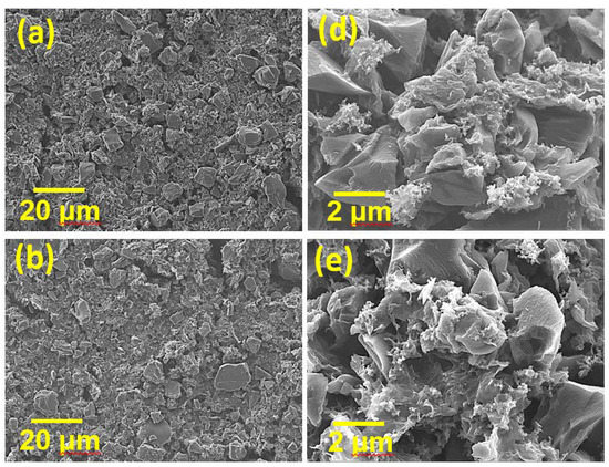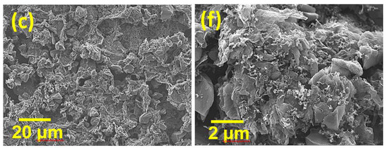 Low-magnification SEM images of (a) AC/HGNS-900 (20:1); (b) AC/HGNS-900 (10:1); and (c) AC/HGNS-900 (5:1) electrodes. High-magnification SEM images of (d) AC/HGNS-900 (20:1); (e) AC/HGNS-900 (10:1); and (f) AC/HGNS-900 (5:1) electrodes.