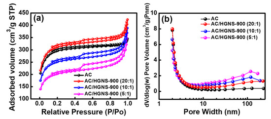 The surface area plays a vital role in determining the EDLC performance. In order to better understand the effects of HGNS-900 incorporation on the electrode specific surface area, N2 adsorption/desorption measurements of the electrode coating layers were performed. As shown in Figure 5a, the calculated BET surface area of the AC electrode was 917 m2·g−1, which is considerably lower than that of AC powder (i.e., 2000 m2·g−1). This reflects the fact that the AC particles agglomerated after slurry coating and drying. Additionally, the electrode binder may block the pores of AC, thereby reducing the surface area. The surface area for AC/HGNS-900 (20:1) reached 968 m2 ·g−1, indicating that the incorporation of HGNS could alleviate the AC aggregation and pore blocking problems. However, with further increasing the HGNS-900 ratio, the BET surface area decreased (e.g., 784 m2·g−1 for AC/HGNS-900 (10:1)) because the intrinsic specific surface area of HGNS-900 is lower than that of AC. The surface area of AC/HGNS-900 (5:1) was reduced to 635 m2·g−1, since the AC surface was covered by agglomerated graphene sheets that shielded the AC pores (see Figure 4f). Figure 5b shows the pore size distribution of various electrodes. It was confirmed that the incorporation of HGNS can create meso- and macro-pores between AC particles. Nevertheless, if the proportion of the macro-pores is too high (i.e., AC/HGNS-900 (5:1)), the electrode becomes loose and discontinuous (see Figure 4c).