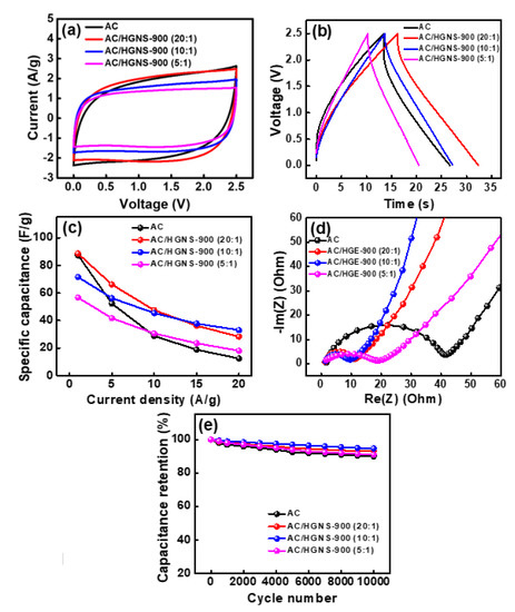 The electrochemical properties of various AC/HGNS-900 cells were evaluated by CV at a potential scan rate of 50 mV·s−1; the obtained data are shown in Figure 6a. Clearly, the incorporation of HGNS-900 can decrease the electrode internal resistance and make the CV shape more rectangular. Figure 6b shows the galvanostatic charge–discharge curves of the cells measured at 5 A·g−1 (the curves measured at different current densities are shown in Figure S3). The calculated specific capacitances for AC, AC/HGNS-900 (20:1), AC/HGNS-900 (10:1), and AC/HGNS-900 (5:1) electrodes are 52, 66, 56, and 42 F·g−1, respectively, at 5 A·g−1. The specific capacitances of various electrodes evaluated at different current densities (from 1 to 20 A·g−1) are shown in Figure 6c and Table S3 (Supplementary Materials). An electrode property comparison with the literature data is shown in Table S4 (Supplementary Materials). At relatively low rates (up to 10 A·g−1), the optimal AC:HGNS-900 ratio seems to be 20:1, because the electrode surface area and conductivity have been improved (vs. the plain AC electrode) at the same time. The AC:HGNS-900 ratio of 10:1 is more favorable for higher rate applications (>10 A·g−1), revealing that the incorporation of HGNS can effectively promote the electrode charge–discharge kinetics. A proper amount of meso- and macro-pores (see Figure 5b) is beneficial for electrolyte penetration, also enhancing the ion transport. However, when the HGNS-900 content is excessive (i.e., AC:HGNS-900 ratio of 5:1), adverse effects on the capacitance and electrode rate capabilities were observed. The Ragone plots for various cells are shown in Figure S4 (Supplementary Materials) to further express these ideas.