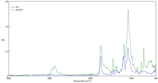 ATR-FTIR spectrum of the polylactide nonwoven (PLA) and nonwoven sample coated by paste concentrations 0.1%fosfomycin (PLA-MOD).