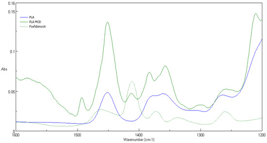 Comparison of ATR-FTIR spectra of fosfonomycin, polylactide nonwoven (PLA) and polylactide nonwoven charged with fosfonomycin (PLA-MOD) is presented in Figure 4, Figure 5 and Figure 6, respectively. Characteristic FTIR signals of fosfonomycin, and polylactide nonwoven (PLA)and polylactide–fosfonomycin nonwoven hybrid (PLA/fosfonomycin) are summarized in Table 4.