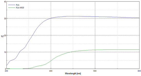 Comparison of transmittance spectra [%T] of polylactide nonwoven samples without (PLA) and with Fosfomycin coating (PLA-MOD) in the range λ = 200–800 nm.