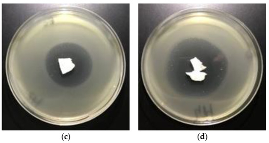 The antibacterial activity of resulting poly(lactic acid)nonwoven fabrics were tested according to PN-EN ISO 20645:2006 (Textile fabrics—Determination of antibacterial activity—Agar diffusion plate test) against a colony of gram-negative bacteria: Escherchia coli (ATCC 25922) and gram-positive bacteria: Staphylococcus aureus (ATCC 6538), analogously as polypropylene nonwovens [65].