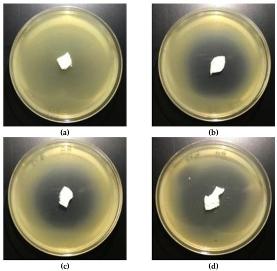 The nonwovens antimicrobial activity tests against S. aureus. Inhibition zones of bacterial growth on Petri dishes, modified PLA nonwoven with fosfomycin coating pastes concentrations: a—0%, b—0.005%; c—0.01%; d—0.1%.