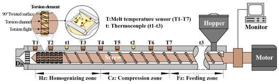 Nowadays, extruder and injection molding machines are widely used for manufacturing polymer composite products. The latter cannot be separated from the fundamental principles of a screw plasticizing system, i.e., the control of plasticization under viscous flow conditions. The precise control of viscous flow dynamics from bulk to the surface combined with their coupling effect of a more uniform temperature distribution leads to systems that are more consistent in their composition, morphology and functionalities. The mixing and thermal management of polymers melts in the screw system to become the key to determining the quality of the composite products [1,2]. The effects of barrel configurations and screw designs on heat and mass transfer have been investigated for a long time and have proved to be unquestionably important attributes for determining thermal efficacy and mixing effectiveness in extrusion and injection molding processes [3,4,5,6,7,8].