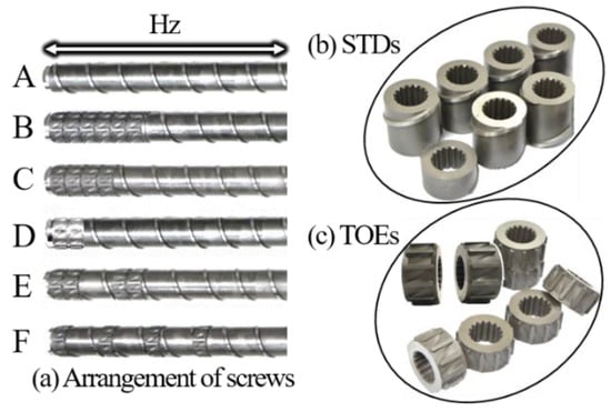 Owing to the modular nature of the screw used in the experiments, six screw inserts with different arrangements of TOEs in the homogenizing zone (Hz) could be mounted, among which screw A (Figure 2a) was a traditional one for comparison purposes and screws B-F were torsional ones (Figure 2a). These modular screws equipped with two insert element types: STDs (Figure 2b) and TOEs (Figure 2c). Among these six screws, each of the torsional screws C, E and F had four TOEs, which were located at different axial positions. The TOEs were partially (screw E) or totally (screw F) separated by one pitch length of the STD element. The torsional screws B and D had six and two TOEs, respectively, all of which were located side by side and close to the end of the extruder head. Table 2 presents a summary of the geometric parameters for both screw elements.