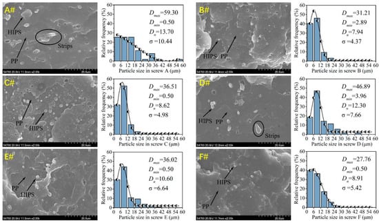 Polymer particle size distribution (HIPS dispersed in PP matrix at the extrusion filament samples) for six sets of screws can be found in Figure 3. The scanning electron microscope (SEM) images clearly show that the particle size of HIPS in screws B and F is finer and smaller than in the others. Furthermore, HIPS particles agglomerate with long strip shapes that are also observed in screws A and D, which indicates poor dispersive mixing. To better quantify the particle size of the dispersed phase, the average particle size (Dn), the maximum value (Dmax), minimum value (Dmin) and standard deviation (SD) of HIPS particles were calculated from each SEM image and summarized in Figure 3. Results indicated that screws A and B have the highest and lowest Dn and SD, respectively, among those six screws; screws A and F have the highest and lowest Dmax, respectively, among the six screws. Therefore, screw B, with six TOEs, shows the best mass transfer and mixing performances among all the screws. Besides, the particle size distribution of HIPS phase fits Gaussian distribution.