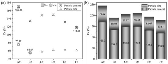Coefficient of variation (Cv) of particle size and content for various screws: (a) Graphs of particle size and content; (b) Weighted data of HIPS particle size and content.