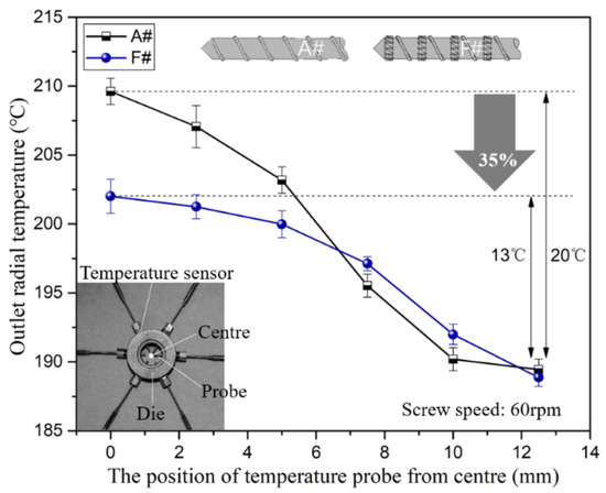 In order to confirm the influence of TOE-configured screws on melt temperature uniformity, six of the melt temperature sensors were employed and inserted through a hole in the die with their ends immersing in different radial positions in the melt. Using screw F as an example, the outlet radial temperature distributions in the extrusion die of screw A and screw F are illustrated in Figure 7. It can be found that the melt temperature in the center of the die is higher than it is near the barrel wall. This is because of the viscous dissipation of polymers, which means that a good heat transfer is needed to facilitate the effective transfer of excess local heat out of the bulk of the polymer melt. Moreover, the radial temperature difference of screw F is 13 °C, whereas the radial temperature difference of screw A is 20 °C, which is 35% higher than that of screw F. Results indicated that the radial temperature difference of melt decreases in the TOE-configured screw owing to its good heat and mass transfer performance.