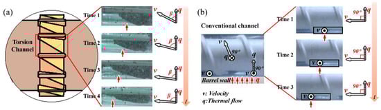 Based on the flow characteristics, a qualitative model for the synergy between velocity and thermal flow fields is proposed, as illustrated in Figure 11. The upper boundary is the barrel wall, which receives thermal energy from the heater, and the bottom boundary is the screw wall, whose surface temperature is lower than that of the barrel wall. From Figure 11a, it can be postulated that the fluid in the STD channel flows forward as a whole rectangle without radial position change, and the heat is transferred through polymer melt layer by layer. Owing to the poor thermal conductivity of the polymers, the fluid close to the screw wall is still cooler than the fluid near the extruder barrel surface. From Figure 11b, it can be seen that the mass transfer occurs in the radial direction due to the twisted groove in the TOE channel, i.e., the hot fluid close to the barrel wall has a chance to flow in a tangential direction, and the cold fluid close to the screw wall can move in an upward direction, thereby, ensuing a better energy transfer and heat exchange. Moreover, the included angle of the flow field and the thermal field will no longer be dominantly perpendicular, i.e., the synergy of velocity and temperature gradient will be enhanced. Because of the previously mentioned synergy, heat transfer will be enhanced in line with the field synergy principle, Equation (4) [25,26].