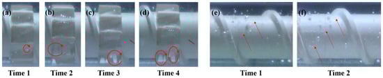 Flow patterns of bubbles in the TOEs and STDs channels at different time: (a) Time 1 in TOE channel; (b) Time 2 in TOE channel; (c) Time 3 in TOE channel; (d) Time 4 in TOE channel; (e) Time 1 in STD channel; (f) Time 2 in STD channel.
