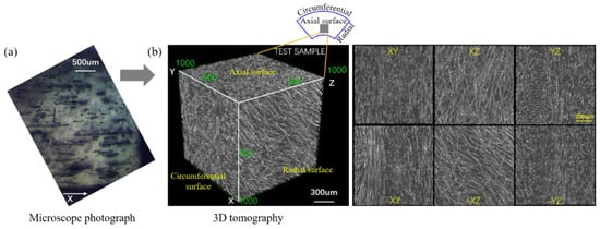 Micromorphology of reclaimed carbon fiber (RCF)/PP: (a) Micrograph in cross-section of RCF/PP; (b) A 3D representation of the individual fibers in the matrix, Voxel size was (1.48 μm).