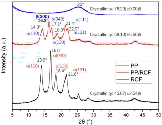 Figure 15 shows the X-ray diffraction (XRD) for PP, RCF and PP/RCF composites. It can be found that there are four significant diffraction peaks in the PP diffraction pattern, 2θ equal to 13.9°, 16.8°, 18.4° and 21.6°, which reflects the crystal plane (110), (040), (130) and (131) of α-crystalline, respectively [31,32]. Besides these four α-crystalline peaks, β- crystalline (300) 2θ equals 16.3° and, α-crystalline (111) peak 2θ equals 21.4° in the diffraction pattern of PP/RCF composites [31,32]. This indicates that carbon fibers can induce the formation of the β-crystalline region in the polypropylene matrix and play a role as a β-nucleating agent. We further observed that the crystallinity of PP/RCF composites increases compared with the pure PP material.