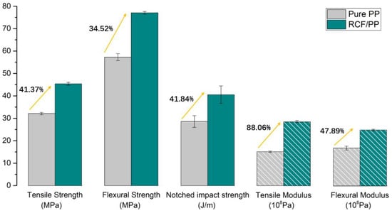 Analyses of tensile strength, flexural strength and impact strength followed the ASTM D638, ASTM D790 and ASTM D256 standards and the results of mechanical properties are shown in Figure 16. Results indicated that the mechanical properties of PP/RCF composites had been significantly improved compared with that of the pure PP samples, i.e., tensile properties, flexural properties and impact properties were improved by more than 40%, 30% and 40%, respectively. A 40% increase in the impact strength is a significant achievement relative to other conventional reinforcing agents. It is primarily due to that fact that an effective stress transfer under a sudden application of load can be well dissipated to the matrix by carbon fiber due to their high stress transfer capacity, even with a shorter and finer length.