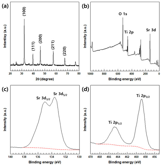 The XRD patterns of synthesized SrTiO3 (Figure 1a) showed diffraction peaks at 32.4°, 39.9°, 46.5°, 57.8°, 67.8°, and 77.2°. that were attributed to, respectively, the (100), (111), (200), (211), and (220) planes of perovskite SrTiO3 (JCPDS no. 35-0734), indicating the formation of pristine SrTiO3 with a well-defined cubic by structure [35,36].