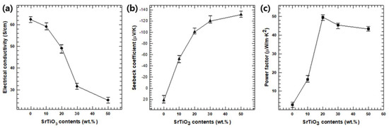 (a) Electrical conductivity, (b) Seebeck coefficient, and (c) Power factor of the SrTiO3/PANI composites as functions of the SrTiO3 content.