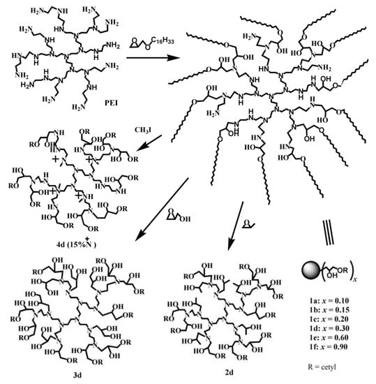 PEI contains dense primary, secondary, and tertiary amino groups (Figure 1). Amino groups from small molecules are reactive and readily modified by chemical reactions, but PEIs are not. Upon encountering reactants such as fatty acid chlorides or fatty acid anhydrides, PEIs tend to immediately form precipitants in conventional media, where the reaction becomes inefficient, and tedious purification of the product is necessary. The insolubility typically results from salt formation in PEI. The degree of N-alkylation in PEI is also critical to its solubility. If the PEI core is sufficiently alkylated with apolar cetyl chains, the resulting macrosurfactant typically demonstrates good solubility in organic solvents. However, if limited cetyl chains are introduced to one PEI, the resulting product appears to be poorly soluble in either polar or apolar media, possibly because of the strong complementary interactions among the polar cores. Several methods, including well-defined ones [33], have been developed for the synthesis of PEI macrosurfactants [25,26,27,28,29,30,31,32,33,34]. The reaction between epoxy compounds and primary or secondary amino groups is mild, efficient, and does not release side products. When the epoxy-amine reaction is applied to PEI modification, quantitative PEI macrosurfactants with designed N-alkylation degrees can be obtained [33], even if the epoxy compound is a macromolecule [33]. PEI macrosurfactants have numerous residual active amines in the core (Figure 1).