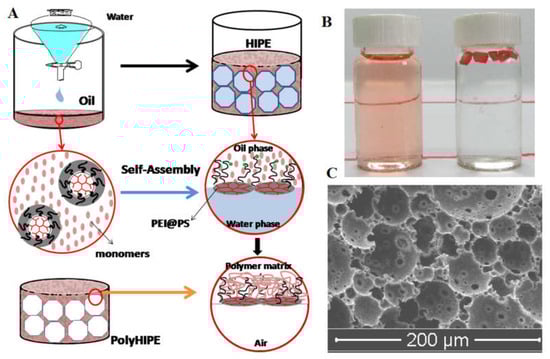 Schematic of dendritic macrosurfactants (PEI@PS)-mediated polyHIPE (A), adsorption of Congo Red by the polyHIPE (B), and (C) SEM micrograph of the polyHIPE [3]. Reproduced with permission from Ye et al., J. Mater. Chem. A; published by the Royal Society of Chemistry, 2015 [3].