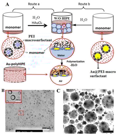 (A) Schematic of two routes for PEI macrosurfactant-mediated synthesis of gold nanoparticle-dictated polyHIPE: (a) chloroauric-containing water is dispersed in PEI-macrosurfactant-containing monomer and (b) water is dispersed in Au@PEI-macrosurfactant (gold nanocomposite)-containing monomer; (B) TEM micrograph of Au@PEI-macrosurfactant stabilized emulsion; and (C) SEM micrograph of polyHIPE with the surface dictated by gold nanoparticles [5]. The scale bar is 4000 nm (1000 nm inset) for (B) and 20 μm for (C). Reproduced with permission from Ye et al. J. Mater. Chem. A; published by the Royal Society of Chemistry, 2015 [5].