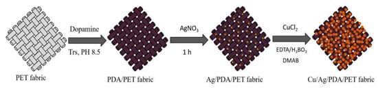 Schematic diagram of the synthesis process of Cu/Ag/polydopamine (PDA)/polyester (PET) fabrics.