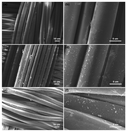 Scanning electron microscopy (SEM) images of (a,b) original PET fabrics; (c,d) PDA/PET fabrics and (e,f) Ag/PDA/PET fabrics.