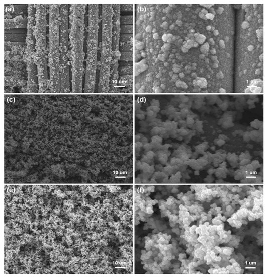 SEM images of Cu/Ag/PDA/PET fabrics with different magnifications: (a,b) reaction time of 2 h; (c,d) reaction time of 4 h; and (e,f) reaction time of 6 h.