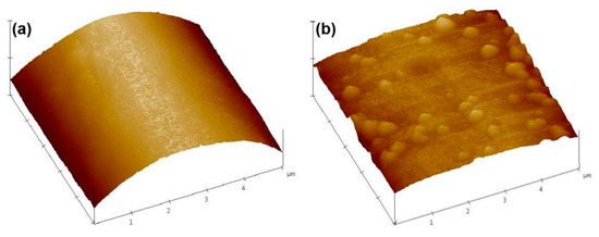 To determine the effect of the Cu NPs on the surface roughness of the fiber, the surface roughness of the untreated and treated PET fiber samples were tested by AFM, as shown in Figure 5. The surface of pristine PET fiber is relatively smooth with a root mean square (RMS) value of 5.4 nm (Figure 5a). Whereas, after the deposition of Cu NPs, a significant increase in surface roughness was observed on the fiber surface (Figure 5b) and the RMS value augmented to 37.8 nm. The results of the AFM analysis indicate the presence of Cu NPs on the surface of the fiber.