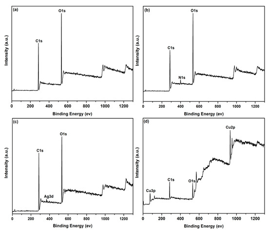X-ray photoelectron spectroscopy (XPS) spectra of (a) original PET fabrics; (b)PDA/PET fabrics; (c) Ag/PDA/PET fabrics; and (d) Cu/Ag/PDA/PET fabrics.