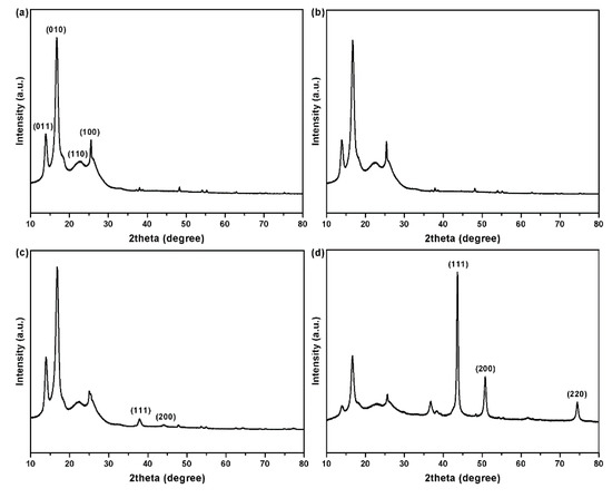 X-ray diffraction (XRD) patterns of (a) PET fabrics; (b) PDA/PET fabrics; (c) Ag/PDA/PET fabrics; and (d) Au/Ag/PDA/PET fabrics.