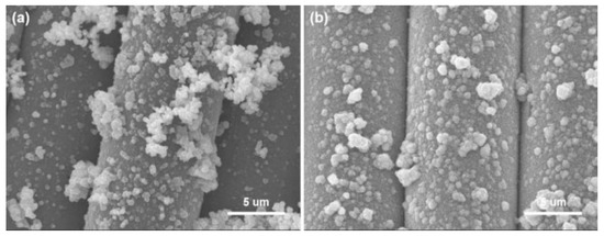 For chemical plating, a surface without catalytic activity needs to be activated, so as to deposit metal particles with catalytic activity on the surface, such as palladium, gold, or silver. PDA contains many catechol and amine functional groups to reduce Ag+ into Ag NPs on fiber surface through chelation, and the Ag NPs as the catalytic activation seeds can catalyze chemical copper plating to deposit Cu NPs on the surface of fabrics [22,23,24]. In the initial stage of the reaction, copper ions in the copper plating solution were preferentially reacted with Ag NPs due to the strong catalytic activity of Ag NPs. As a result, Cu NPs were dispersed uniformly to cover the surface of fibers (Figure 3a). The fiber surface is covered by nanoparticles, but the profile is clearly visible (Figure 3b). Reaction time has a direct effect on the deposition of Cu NPs. When the reaction time was 4 h, copper ions were reduced to Cu NPs by the reducing agent with visible agglomeration on the surface of fibers (Figure 3c,d). As seen from Figure 3e,f, Cu NPs agglomerated seriously on the fiber surface when the reaction time was 6 h, and the fiber profile was hard to distinguish as a result. These results show that Ag NPs as the catalytic active centers promoted the deposition of Cu NPs on the surface of fibers with uniformity and density.