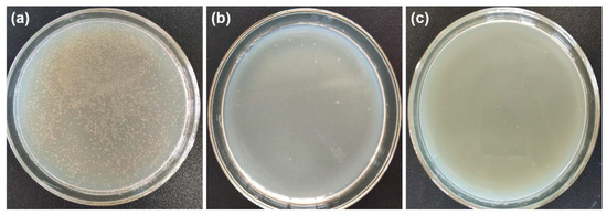 Antibacterial activities of (a) PET fabrics; (b) Cu/Ag/PDA/PET fabrics; and (c) after washing for 10 cycles.