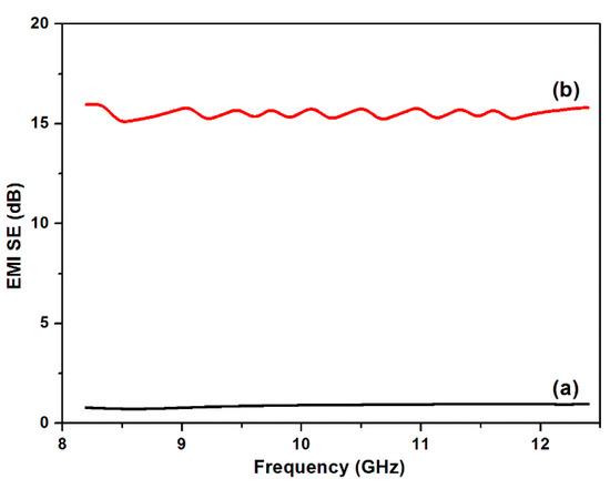 The fabric samples were measured using N9917A FieldFox Microwave Analyzer (Agilent Technologies, Santa Clara, CA, USA) measurement system in the frequency range of 8.2–12.5 GHz (X-Band). The samples were cut into a rectangle with a dimension of 50 × 50 mm2 to fit the waveguide holder. The scattering parameters (S-parameters) were obtained from the Electromagnetic interference shielding effectiveness (EMI SE) test at room temperature. The total EMI SE can be calculated as follows [20,21]: