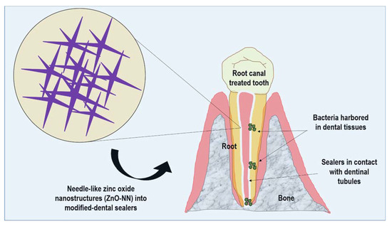 The antibacterial performance of ZnO nanostructures depends on their size and shape, surface-to-volume ratio, and the number of oxygen vacancy sites [1,19]. ZnO nanostructures hamper the growth of Enterococcus faecalis, an essential bacterium in the post-infection of root canal treated teeth, and failure of treatment [20]. This antibacterial activity occurs via membrane disorganization and gene downregulation promoted by ZnO [18,21]. These outcomes are exciting and lead to the questioning of whether ZnO nanostructures could be used as bioactive inorganic fillers in dental sealers for root canal treatment. However, the maintenance of a range of functionalities of dental sealers during the root canal obturation is essential to attain the desired treatment outcome. Ideally, dental sealers should be capable of (1) penetrating and sealing the dentinal tubules; (2) binding intimately to both the organic and inorganic phases of dentin; (3) decreasing microorganisms viability and neutralizing their products; (4) predictably inducing a regenerative response, and (5) strengthening the root complex system [22,23].