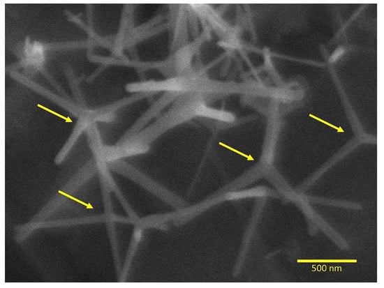 Scanning electron microscopy of ZnO-NN showing the nanostructure after the thermal evaporation process (magnification of 40,000×). The arrows indicate the nucleation core that originates the extensions with distinct directions within three-dimensional space.