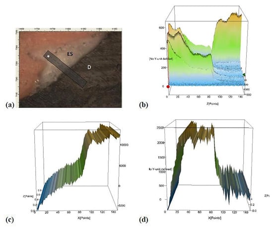 Representative micro-Raman analysis at the dentin-sealer interface. Image (a) represents the interface dentin-sealer, where ES states for experimental sealer, D states for dentine, and * is the analyzed line at the interface. Image (b) represents the total interface area. Image (c) displays the graph when there is integration in micro-Raman analysis for the hydroxyapatite (HAp) using the peak at 910 cm−1. Image (d) shows the graph when there is integration in the micro-Raman study for ZnO using the peak at 582 cm−1. Note that from the sealer analysis into dentin, there is a decrease in the ZnO peak and an increase in the phosphate peak contained in hydroxyapatite (HAp). There is a site in the center of the interface (image b) where there is still a high peak of phosphate and the maintenance of the ZnO peak. The overlap of graphs (c,d) shows the presence of ZnO and phosphate in the same site, suggesting that the ZnO was able to penetrate the dentinal tubules.