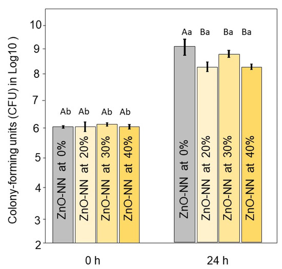 The use of sealer exhibiting antibacterial properties may be useful to decrease or avoid the growth of the remaining microorganisms in the endodontic system [54]. E. faecalis is a recognized pathogen in post-treatment endodontic infections, and it is considered the most resistant species against chemomechanical preparation [55]. Considering the demonstrated potential antimicrobial effect of ZnO-NN and the size-dependent characteristic of this effect, these small particles may contribute to dentin tubules’ disinfection. Usually, the endodontic proposed materials are tested against E. faecalis due to the reasons described above. Here, we have estimated the antibacterial activity of sealers containing ZnO-NN using a relevant single-species model. The clinical predictive value of in vitro tests is currently often limited. In this study, even though we observed statistical difference in comparison to 0 wt.% of ZnO-NN, there was no substantial log reduction. The reason for that may be because the test was conducted against planktonic bacteria. Therefore, the leaching of more ZnO-NN to the broth containing E. faecalis would be necessary to increase the differences. After 24 h, the material was probably stable enough not to provide a high quantity of free Zn+.
