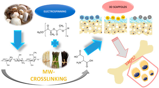 The 3D hybrid scaffolds were prepared via combination of PLA nanofibers and chitosan crosslinked aerogel containing hydroxyapatite nanoparticles. The biomaterials were further modified with three types of nanoparticles: TiO2, Au, and Pt. The general principle of the supporting matrixes is given in Figure 1.