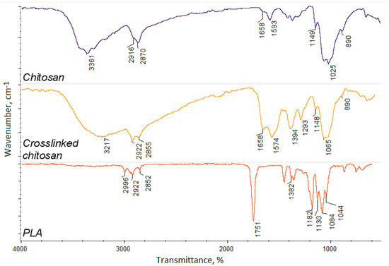 FT-IR spectra of the pure chitosan, crosslinked chitosan, and poly (lactic acid) nanofibers.