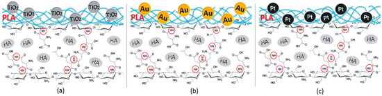 (a) 3D hybrid scaffolds’ chemical structure doped with TiO2 NPs; (b) 3D hybrid scaffolds chemical structure doped with Au NPs; and (c) 3D hybrid scaffolds doped with Pt NPs.