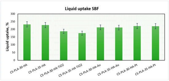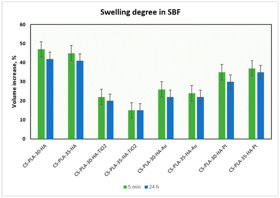 The best results were obtained for samples CS-PLA-30-HA (232%) and CS-PLA-35-HA (227%), which contained only HA NPs. The scaffolds containing metallic NPs were characterized by slightly worse swelling capacity: 221% and 220% for CS-PLA-30-HA-Pt and CS-PLA-35-HA-Pt, respectively, while for CS-PLA-30-HA-Au, it was 213%, and for CS-PLA-35-HA-Au, it was 211%. The significantly lower sorption efficiency was obtained for the samples containing TiO2 nanoparticles, and this can be caused by pores’ clogging by agglomerated NPs which hampered water molecules’ migration inside the 3D matrix. What is important is that the studies were performed in the simulated body solution, which contained various ions. Their presence in many cases decreases sorption abilities of the hydrogels due to their interactions with functional groups. In the case of proposed supporting tissue-regeneration materials, all of them exhibited SC above 200%, meaning that they are suitable for bone recovery [1,5,6]. High sorption ability is especially important during the biomineralization process, which significantly hampers water absorption by hydrogels [41]. An excellent swelling capacity also gives them the possibility of incorporation growth factors or genes. Additionally, swelling degree in terms of a scaffold volume change after liquid uptake was investigated (Figure 5). One may observe that all samples, after 5 min, changed their volume, as a result of the soaking up with simulated body fluid. However, the increase was not very high, and this can be explained by the fact that the pores, after contact with water molecules, decreased due to the hydrophilic interactions with free hydroxyl, carboxyl, and amino groups of the scaffold and electrostatic interactions. The swelling degree is correlated with the swelling capacity. Notably, a small change (decrease) of the scaffolds’ volume was observed in time, and the volume stabilized after one hour. Taking everything under consideration, although a small change in the samples’ dimensions was observed, it can be omitted due to the fact that no post-soaking volume increase was observed. The scaffolds are immersed in aquatic solutions (SBF, phosphate buffer, etc.) before implementation inside a patient’s body. If it does not increase its volume in time, it may be assumed that it will not cause any damage to the tissues and nerves placed nearby [15].