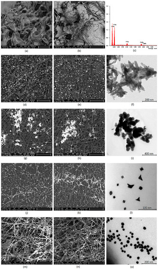 (a) SEM microphotograph of the pure chitosan scaffold (scale bar 500 µm); (b) SEM microphotograph of the chitosan scaffolds modified with HA nanoparticles (scale bar 200 µm); (c) elemental analysis of the scaffold composition; (d) SEM microphotograph of the PLA nanofibers obtained under 30kV covered with HA particles (scale bar 50 µm); (e) SEM microphotograph of the PLA nanofibers obtained under 35kV covered with HA particles (scale bar 50 µm); (f) TEM microphotograph of the prepared HA nanoparticles; (g) SEM microphotograph of the PLA nanofibers obtained under 30 kV covered with TiO2 nanoparticles (scale bar 50 µm); (h) SEM microphotograph of the PLA nanofibers obtained under 35kV covered with TiO2 nanoparticles (scale bar 50 µm); (i) TEM microphotograph of the prepared TiO2 nanoparticles; (j) SEM microphotograph of the PLA nanofibers obtained under 30 kV covered with Pt nanoparticles (scale bar 50 µm); (k) SEM microphotograph of the PLA nanofibers obtained under 35 kV covered with Pt nanoparticles (scale bar 50 µm); (l) TEM microphotograph of the prepared Pt nanoparticles; (m) SEM microphotograph of the PLA nanofibers obtained under 30 kV covered with Au nanoparticles (scale bar 30 µm); (n) SEM microphotograph of the PLA nanofibers obtained under 35 kV covered with Au nanoparticles (scale bar 30 µm); (o) TEM microphotograph of the Au nanoparticles.