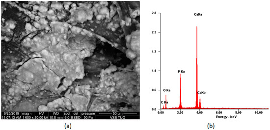 Figure 8 presents the scaffold surface after seven days of in vitro biomineralization. Sedimented ions, which formed mineral precipitate, can be noticed. The coating is quite smooth and uniform, as is desired [40]. XRF analysis confirmed hydroxyapatite formation.