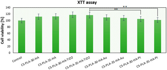 The newly developed scaffolds are dedicated to bone-tissue engineering, so one of the principal properties for these biomaterials is biocompatibility. The cytotoxicity study was carried out on an MG-63 human osteosarcoma cell line, which is typically used for this purpose [39]. Figure 9 shows results of cell culture in the presence of scaffolds. After seven days of culture, MG-63 cells’ growth was not disturbed. It can be noticed that, depending on the chemical composition, the number of viable cells is different. Although in all cases the % of living cells is above 100% (control—cells cultured without scaffolds), the presence of various nanoparticles affects osteoblasts’ proliferation activity. Two types of biomaterials display significant bioactivity CS-PLA-30-HA-TiO2 (118%) and CS-PLA-35-HA-TiO2 (117%). This result corresponds with other researchers’ data since titanium dioxide nanomaterials are known for their biosafety with bone-tissue cells [32,33,34,35]. Slightly worse results were obtained for CS-PLA-30-HA (112%) and CS-PLA-35-HA (113%), and this is not surprising, since the presence of the hydroxyapatite nanoparticles is known to have a positive effect on bone cells [9,27]. Notably, the scaffolds doped with metallic nanoparticles also exhibited good biocompatibility. Gold NPs are well-studied nanomaterials; however, it is known that their in vitro behavior depends on particle size and shape, as well as the presence of stabilizing agents [25,26,27]. Au NPs prepared for this study due to the size above 10 nm do not penetrate nor damage cell membrane and do not affect cell cycles, a finding which corresponds to other researchers’ results [27,29,30]. The results show that, after seven days, the cell number for sample CS-PLA-30-HA-Au was 110% and CS-PLA-35-HA-Au was 108%; thus, their addition did not cause cytotoxic effect. Finally, samples modified with Pt nanoparticles showed 105% and 102% of cells comparing to the reference. Lack of cytotoxicity can be assigned to their size higher than 10 nm and lack of sharp edges. Additionally, in contrast to silver nanoparticles [28], they are characterized by very good chemical stability and are known to disarm reactive oxygen species (ROS), which may have a positive effect on cells’ proliferation, since they prevent their apoptosis triggered by oxygen radicals [25,26,27,31]. Lack of scaffolds’ toxicity can be also assigned to the well-known biosafety of semi-components, such as chitosan [34,35,36] and PLA [2,3,4,5,6,7], which are widely used for bone-tissue regeneration [38]. Moreover, the scaffolds’ architecture seems to provide good conditions for cells’ growth and do not hamper their natural behaviors [38]. The findings show that all of the prepared scaffolds can be considered to be non-toxic and can be used for further studies, which should be focused on in vivo experiments [42,43,44,45,46].
