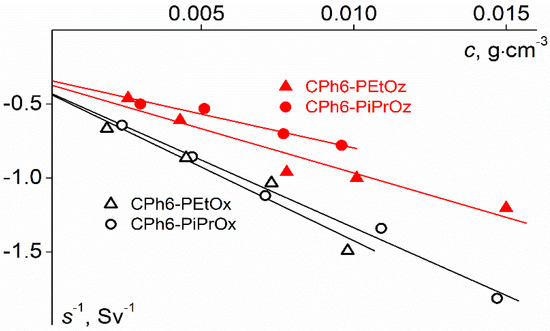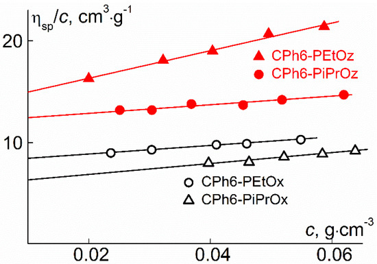 where R is the universal gas constant and T is the absolute temperature. The specific partial volume was determined using a densitometer (Density/Specific Gravity Meter DA-640, KEM, Tokyo, Japan). The values of for investigated stars differed slightly (Table 1). The obtained values of for the CPh6-PEtOx are close to those reported in the literature for linear PEtOx, to reported values from Schubert and Nischang et al. [26] of = 0.84 cm3g−1, from Ye et al. [42] of = 0.85 cm3 g−1, and = 0.87 cm3g−1 from Chen et al. [43]. In addition, the specific partial volumes for CPh6-PAlOx are in good agreement with the values of for star-shaped PEtOx and PiPrOx [44,45,46]. MMs calculated by the relation (2) are shown in Table 1, which also gives the values of intrinsic viscosity [η]. The intrinsic viscosity was measured with the Ostwald-type Cannon–Manning capillary viscometer (Cannon Instrument Company Inc., State College, PA, USA) at 21 °C. The solvent efflux time was 48.5 s. Figure 3 shows reduced viscosity ηsp/c versus concentration for solutions of synthesized stars. These dependences were analyzed using the Huggins equation