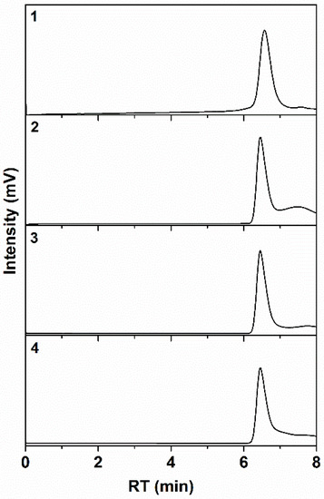 GPC curves of star-shaped CPh6-PEtOx (1), CPh6-PiPrOx (2), CPh6-PEtOz (3), and CPh6-PiPrOz (4).