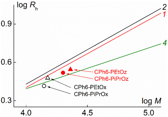 A similar conclusion can be made by comparing the molar mass dependences of the hydrodynamic radii Rh (Figure 8). For the studied CPh6-PAlOx and CPh6-PAlOz, the values of Rh-D are slightly less than Rh for linear PEtOx and are close to the hydrodynamic radius of C8A-PS molecules. The difference in Rh for the compared polymers is noticeably smaller than in the case of intrinsic viscosity. This is due to the lower sensitivity of the Rh value to the change in the shape of the molecules and the molar mass of the polymer compared to the [η] value [47].