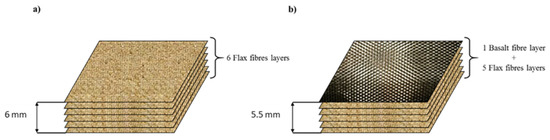 Formulation of laminates: (a) Flax/VE laminate with a thickness of 6 mm, and (b) flax/basalt/VE hybrid laminates with a thickness of 5.5 mm.