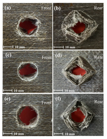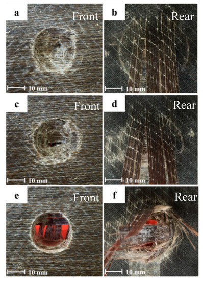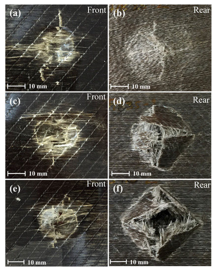 Figure 11 shows the damage of the hybrid sample with one basalt layer on the top. In the pictures (a) and (b), a 50 J incident energy was not high enough to perforate the sample thanks to the basalt layer on the top. However, in the other images (Figure 11e–f) for 60 and 70 Joules of incident energy, the maximum energy absorbed is exceeded and all the layers of fibres are broken. As a result, the samples are fully penetrated.