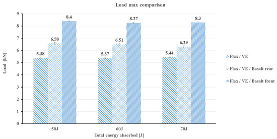 Maximum load comparison of different impact configurations of flax/VE, flax/VE/basalt rear, and flax/VE/basalt front for each incident energy employed.