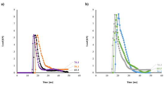 Typical load vs. time traces for 50 J, 60 J, and 70 J impacted (a) flax and (b) flax/basalt hybrid composites.
